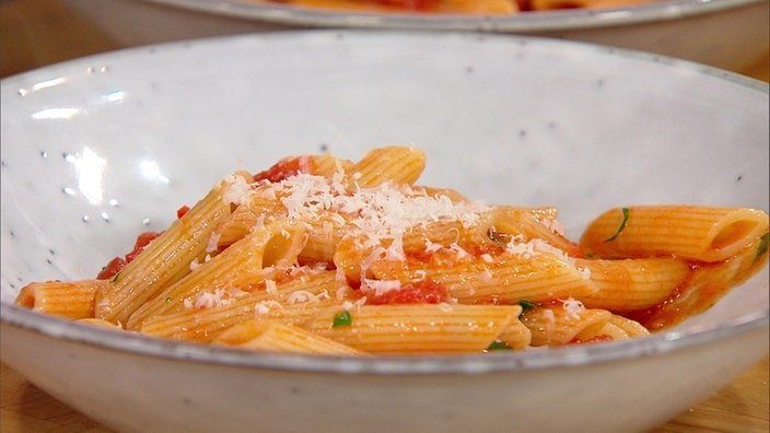 | | Aus reifen Tomaten, Knoblauch und Peperoni zaubert Lars Middendorf einen feurig-frischen Klassiker, wie ihn wohl auch die italienische Mamma kochen würde: Penne all’arrabbiata. | |
