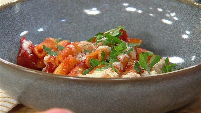 | | Würzig und herrlich cremig wird es mit diesen Maccheroni. Lars Middendorf serviert sie in fruchtigem Tomatensugo mit Knoblauch und Rauchpaprika. | |