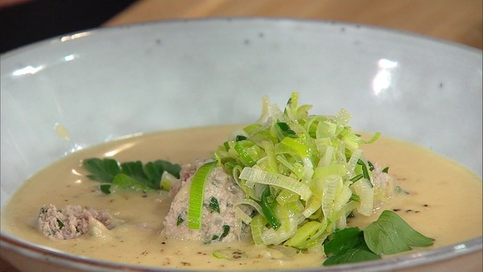| | Unser Sternekoch Alexander Wulf zaubert eine cremige Kartoffel-Lauchsuppe mit saftigen Fleischbällchen. Das schmeckt nach Frühling! | |